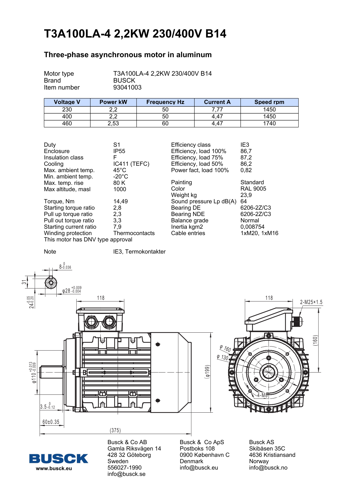 T3A100LA-4 2,2KW 230/400V B14M U